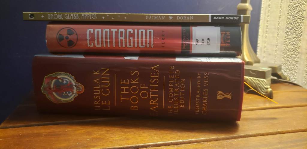 Contagion I picked up at the local library. It was pretty good. I’m not completely enamored with the final premise, but I actually enjoyed the shifting perspectives between Callie and Shay, which is unusual for me. Terry handles the switches deftly. I’ll probably pick up the sequel when it comes out.